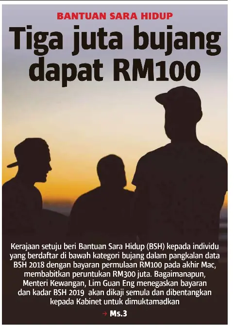 Bantuan sara hidup (bsh) 2019 sebanyak rm100 akan diberikan kepada individu di bawah kategori bujang pada hujung mac ini, kata menteri menurutnya, berhubung dengan bayaran selanjutnya, kadar bantuan bsh bagi 2019 untuk golongan bujang akan dikaji semula dan dibentangkan kepada.