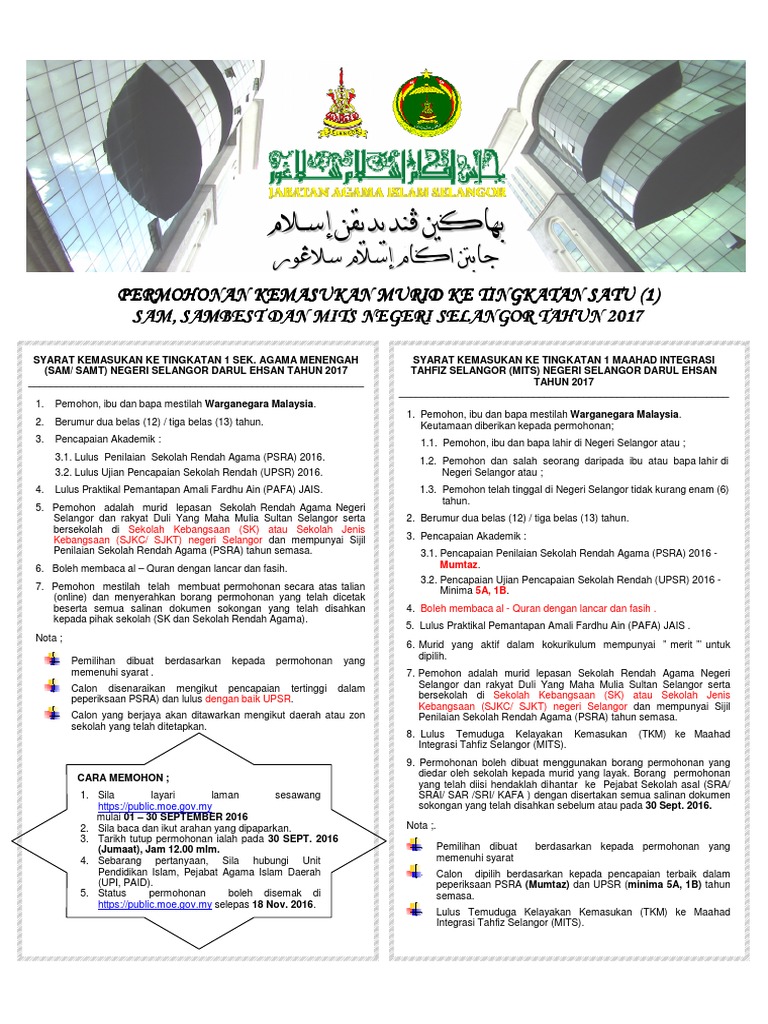 Butiran permohonan sbp tingkatan 1. Manakala kemasukan ke maktab rendah sains mara (mrsm), permohonan kemasukan ke tingkatan 4 telah ditutup lebih awal pada 31 oktober 2017. Pengambilan kata laluan dalam talian bagi tingkatan 4 pengambilan kata laluan adalah untuk membenarkan pemohon mengisi borang permohonan memasuki mrsm secara dalam talian. Pemohon boleh memohon sebelum keputusan upsr/pt3 diumumkan. Permohonan dibuka kepada pelajar tahun enam yang telah menduduki peperiksaan upsr 2016.